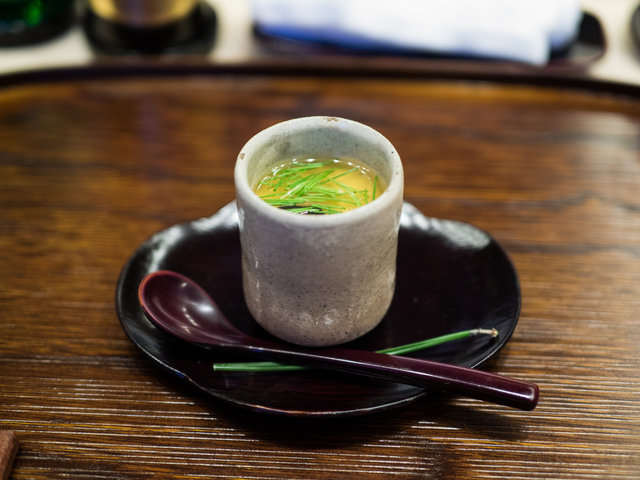 Vi skulle bare til denne ene bortgjemte plassen i plaskende regnvær. Inn i det lille rommet som søkkvåte katter. Fikk plantet kroppene våre ved den sobre spisebaren av utsøkt tremateriale. Da mesteren Kasumicho Suetomi gjorde oppmerksom på at han ikke ønsket fotoapparater og annet utstyr på den elegante spisedisken forsto vi alt om japansk kultur. Vi satt rett og slett til bords hos en famille med et språk og en mimikk som om vi hadde landet på en annen planet. Og det var ikke mange der. Det var oss, sidemannen til venstre og tre velkledde japanske damer til høyre. I et annet separat rom satt et selskap på to unge japanske par. I ærbødighet for mesteren som utførte kokekunsten rett foran øynene våre var det ikke mye samtale langs disken før vår sidemann ble for nysgjerrig og lurte på hvor vi kom fra og hvordan vi hadde funnet dette stedet som selv for innbyggerne var en hemmelighet. For ham var det blitt stamstedet. Måtte hit en gang i uken. En seremoni å la kroppen glede seg over den rene maten, rene ekstrakter av fisk, grønnsaker og fuglekjøtt omgjort til dashi, tofu, ris og forførende aromater i hver munnfull. Som å dukke inn i et smaksansenes kabinett av uoppdaget kulinarisk gods og vandre rundt i et annet rike av østens mysterier.
