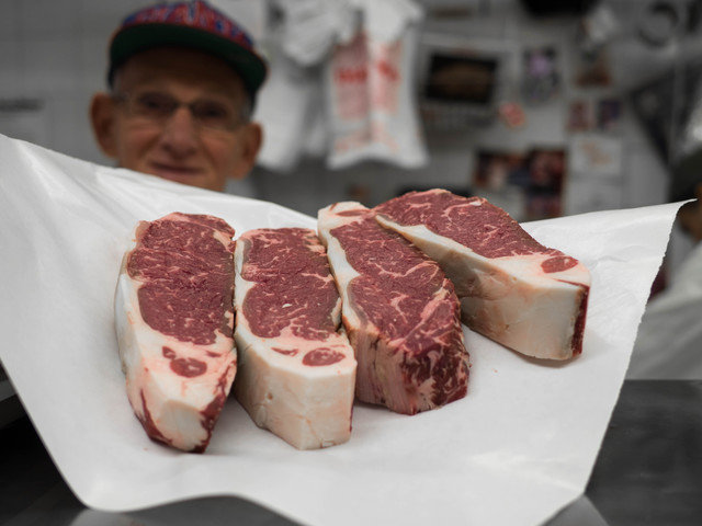 "Live, work and trade in the Village” sitter i veggene. Bak disken møter man Frank, Matthew, Jerry, Peter og Joseph. I kjøledisken ligger praktfull Black Angus Beef. Be om Porterhouse, Sirloin eller New York strip steak og alt det man ellers kan fantasere om som objekt for en festmiddag. Frank kutter kjøttet som pappaen lærte ham, legger det på vekten, noterer beløpet med et lite smil. Selv kan jeg også smile. Det er ikke ofte valuta for pengene klisjeen dukker opp på Manhattan. En reise tilbake i tid, det beste amerikanske kjøttet, vennligheten bak disken, og humoren i det øyeblikket Jerry med hjelm og hvit frakk ut fra kjølerommet innerst i lokalet takker for handelen da vi er på vei ut og roper ”auf wiedersehen!”.